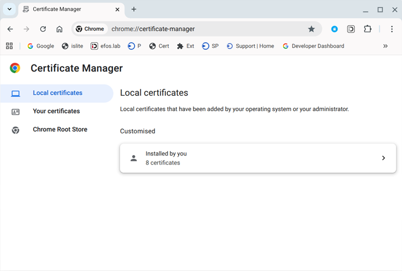 - Under "Local certificates" click on "Installed by you"